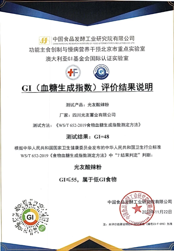 4月23日訊:近日,光友薯業(yè)收到來(lái)自中國(guó)食品發(fā)酵工業(yè)研究院GI營(yíng)養(yǎng)工作室的喜訊,光友薯業(yè)生產(chǎn)的明星產(chǎn)品——光友酸辣粉成功通過(guò)中國(guó)食品發(fā)酵工業(yè)研究院GI國(guó)際聯(lián)合研究與測(cè)試實(shí)驗(yàn)室標(biāo)準(zhǔn)化GI測(cè)試流程,被認(rèn)證為低GI食物。