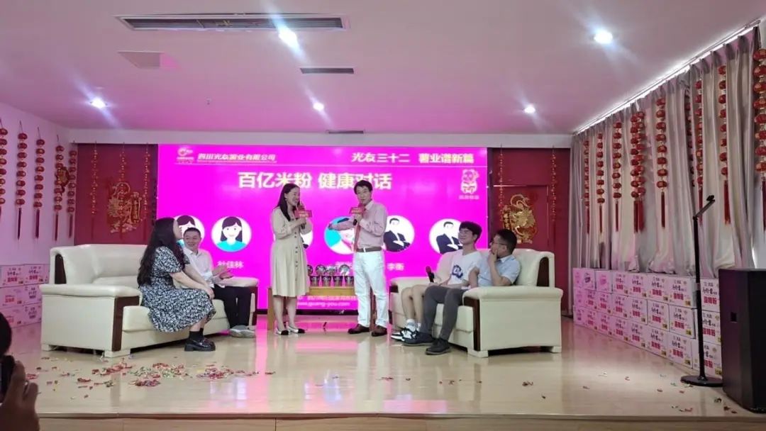 為更直觀地了解光友薯類健康主食,本次活動(dòng)還特別邀請(qǐng)五位嘉賓上臺(tái)與鄒光友董事長(zhǎng)現(xiàn)場(chǎng)健康對(duì)話,對(duì)話的嘉賓分別是綿陽城市學(xué)院雙創(chuàng)中心主任李衡、綿陽市靖華節(jié)能環(huán)??萍级麻L(zhǎng)王華、四川敬科智能裝備科技副總經(jīng)理肖飛雨、綿陽西城大學(xué)生創(chuàng)新創(chuàng)業(yè)園創(chuàng)業(yè)導(dǎo)師杜佳林、綿陽城市學(xué)院雙創(chuàng)中心何愛清,與會(huì)嘉賓在這里共同探討米粉行業(yè)的未來發(fā)展趨勢(shì)及健康飲食的重要性,共享基地帶動(dòng)大學(xué)生創(chuàng)新創(chuàng)業(yè)發(fā)展。